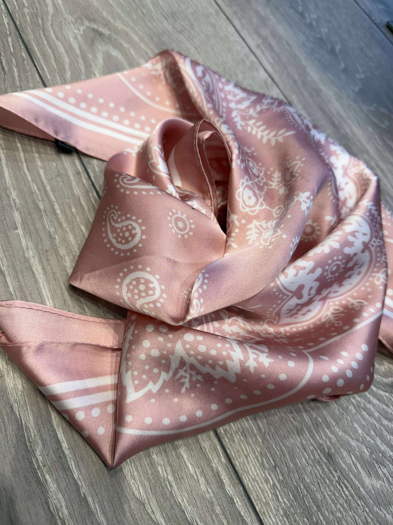 BESKRIVELSE: Flot tørklæde i det smukkeste bandana i fin semi skinnende satin. Tørklædet er kvadratisk måler 66 x 66 cm.