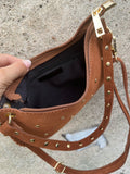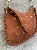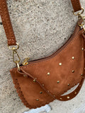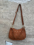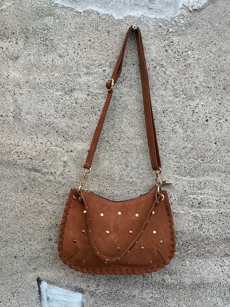 BESKRIVELSE: Smuk taske i ruskind. Den har to remme, den ene kan bruges som cross over og den anden i hånden eller over skulder. Den har lynlåslukning og 1 rum indvendig. Der er nitter i guldtonet.
