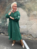 BESKRIVELSE: Lækker kjole med lækre detaljer. Den har 7/8 lange ærmer og er længere bag til. Der er broderinger på kjolen med firkløvere og hestesko, så det er en lykkebringende kjole.