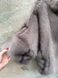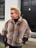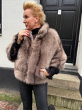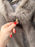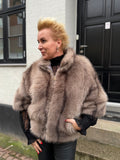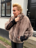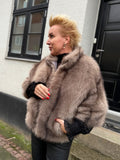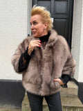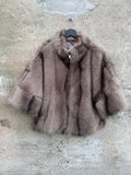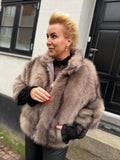 BESKRIVELSE: Smuk pels i vegan, det vil sige ikke ægte pels. Det er en super flot efterligning af ægte pels raccoon = vaskebjørn. Den har 3/4 lange ærmer og skorstens-krave.