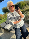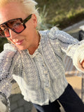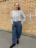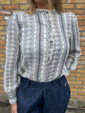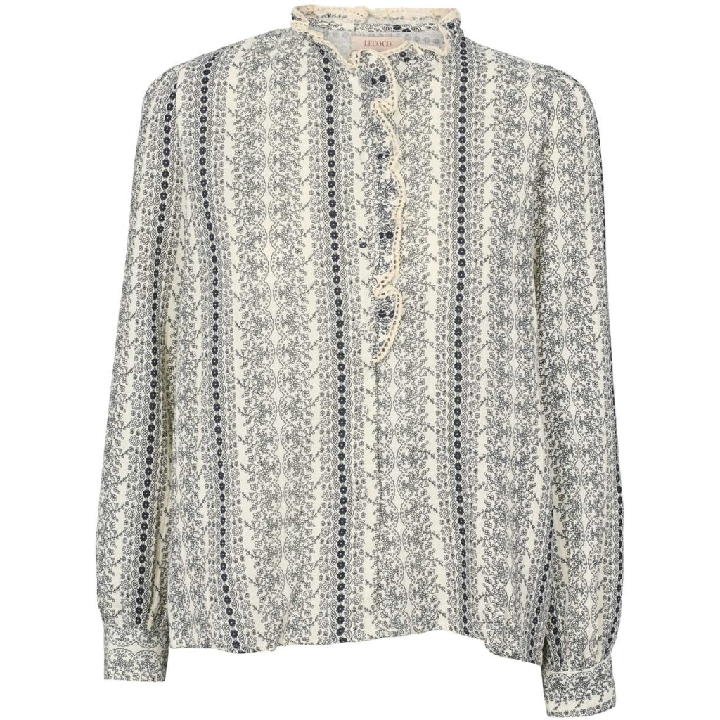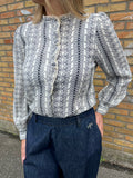 BESKRIVELSE: Super flot vid skjorte med rund hals og lange ærmer. Der er blondekant i hals og langs knapper foran. Der er i flot mønster.