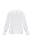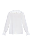 BESKRIVELSE: Løstsiddende og femin bluse i lækker kvalitet. Den har V hals og flæsedetalje. Der er flæse på de lange ærmer også.