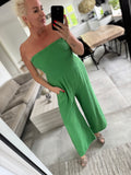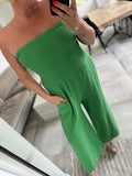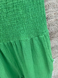 BESKRIVELSE: Flot jumpsuit / buksedragt med smock-elastik foroven og ben med vidde nederst. Der er lommer i begge sider.