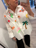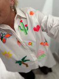 BESKRIVELSE: Lækker skjorte med lange ærmer og almindelig krave. Super smuk skjorte med mange farvede patches (mærker) fx palmer, hjerter, blomster og sommerfugle.