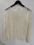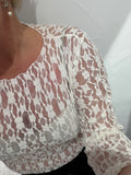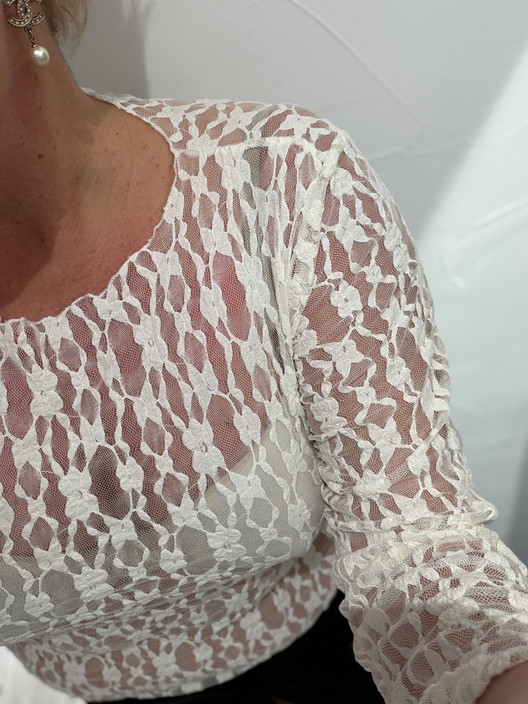 BESKRIVELSE: Lækker bluse i blonde til at have under strik, veste eller hvad du har lyst til. Den har rund hals og lange ærmer.