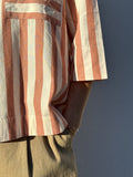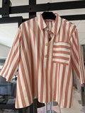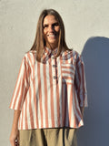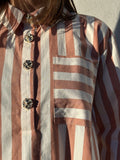 De lodrette striber i varme, afdæmpede nuancer skaber et grafisk udtryk, mens de dekorative knapper og brystlommen med kontrasterende striber tilfører blusen karakter.