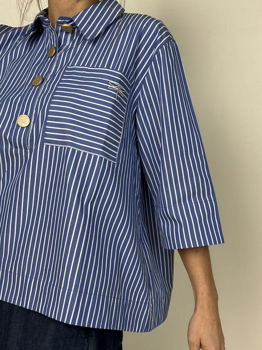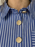 BESKRIVELSE: Porto Blouse er en moderne stribet skjorte til kvinder med et afslappet og tidløst udtryk. Denne version er designet i blå med fine hvide striber, som giver et klassisk og friskt look, mens guldfarvede knapper og et diskret logobroderi tilfører et eksklusivt og feminint præg.