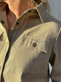 Ærmerne har fuld længde og afsluttes med manchetter og knaplukning, så pasformen nemt kan justeres. De diskrete knapper matcher den sandfarvede canvas og bidrager til et roligt og sammenhængende udtryk.