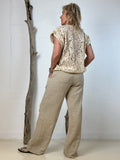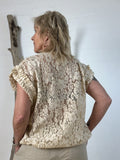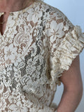 Toppen har fine flæsedetaljer ved ærmerne, der tilfører et blødt og feminint look, mens den enkle halsudskæring holder designet tidløst og anvendeligt. Materialet føles let og behageligt mod huden og falder flot, uden at miste form.