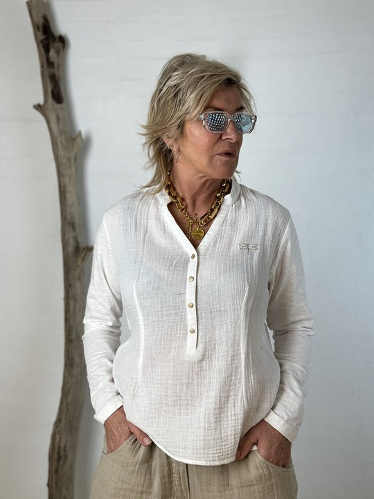 Blusen har en enkel krave med V-udskæring samt en stolpelukning, der går til under brystet. De smukke guldknapper tilfører et eksklusivt og gennemført touch.