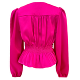 BESKRIVELSE: Utrolig flot bluse i en lækker kvalitet. Den har puf-ærmer og er figursyet. Den har flottede tvistede detaljer i taljen og smockelastik bag.