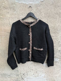 BESKRIVELSE: Smuk cardigan med knapper foran og lommer på siden. Der er leopardmønster på knapper, kant langs knapper og på lommerne.