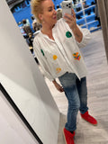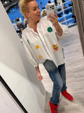 BESKRIVELSE: Super flot vid skjorte med rund krave, der går ned i stolpe og lange ærmer. Der er broderede smukke hjerter og andre figure på fronten af hele skjorten.