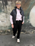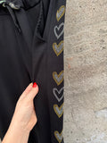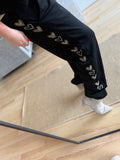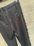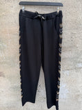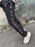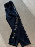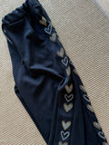 BESKRIVELSE: Lækker buks i blød kvalitet, med dejligt stræk. Der er lommer i siden, bagpå og elastik og bindebånd i taljen. Der er søde små hjerter ned langs begge ben på siden. En lækker slapper buks som sagtens kan styles op til pænt brug også.