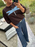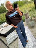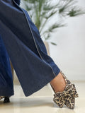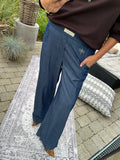 BESKRIVELSE: Smukke bukser i lækker denim. Bukserne har elastik i talje, med snørre med i enden med guld detalje. Sidelommer og baglommer. Der er logobroderi i guld på den ene forlomme. Bukserne har vidde lige ben.