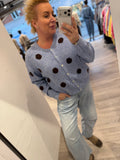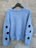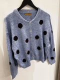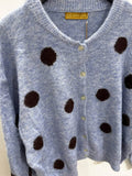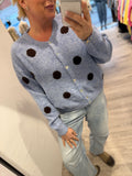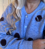 BESKRIVELSE: Lækker strikbluse / cardigan med rund hals og lange ærmer. Den er blå i bunden og med brune prikker.