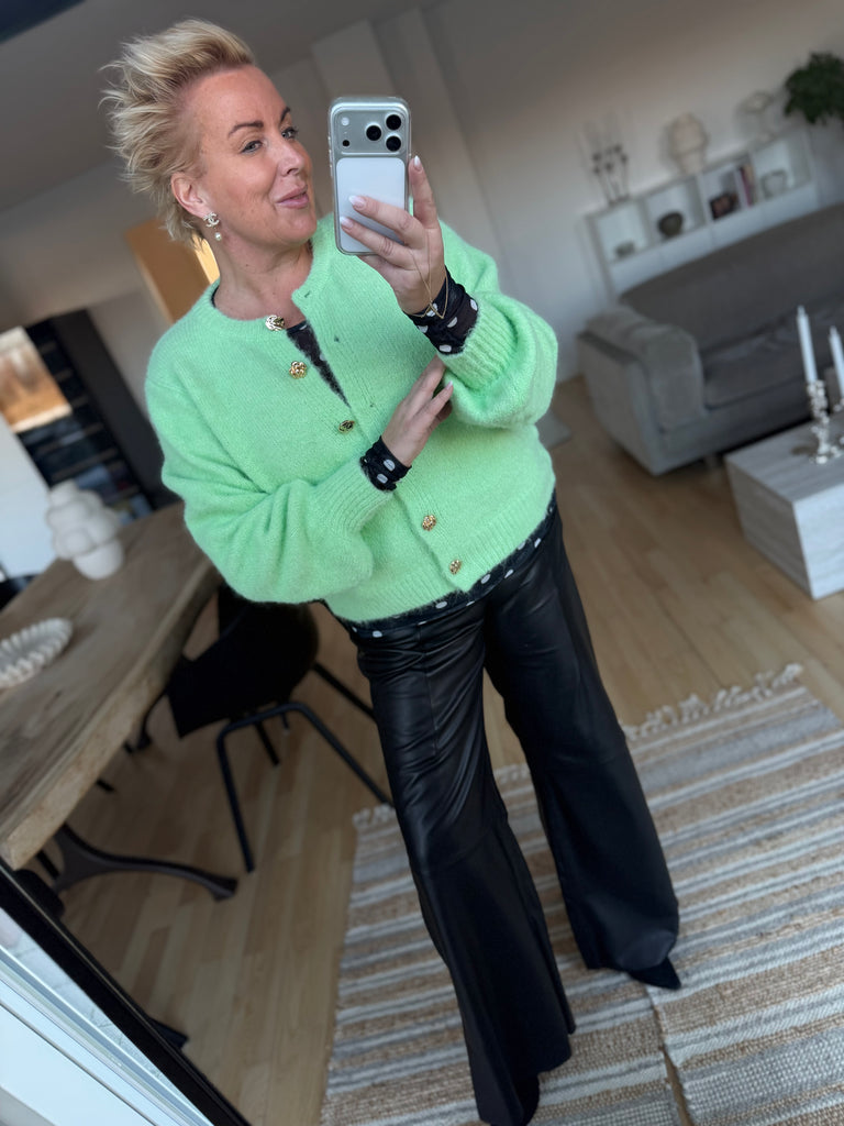 BESKRIVELSE: Smuk cardigan med rund hals og flot vidde i de lange ærmer. Ærmerne har smallere ribkant for enden, samt samme ribafslutning i halsudskæringen. Cardiganen lukkes med flotte guldfarvede knapper i to forskellige slags.