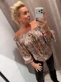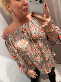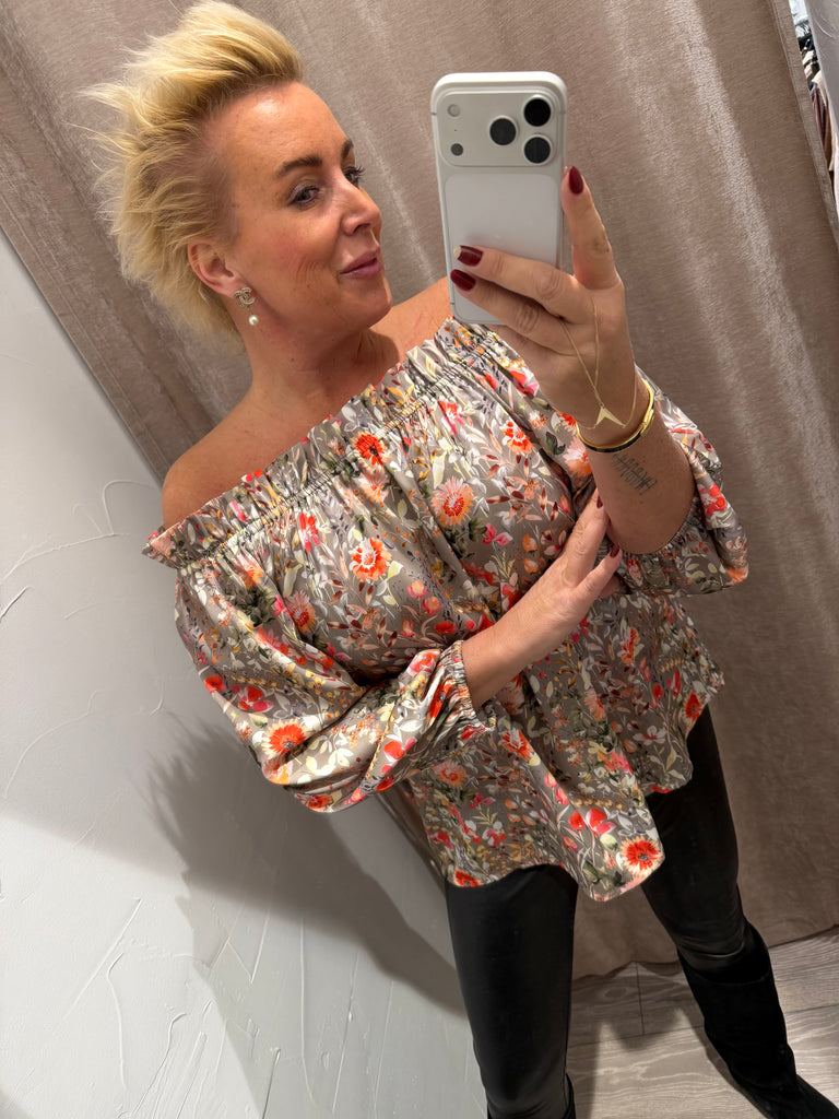 BESKRIVELSE: Lækker bluse med off shoulder og lange ærmer. Så flot til festlige lejligheder og til en lun sommerdag.