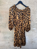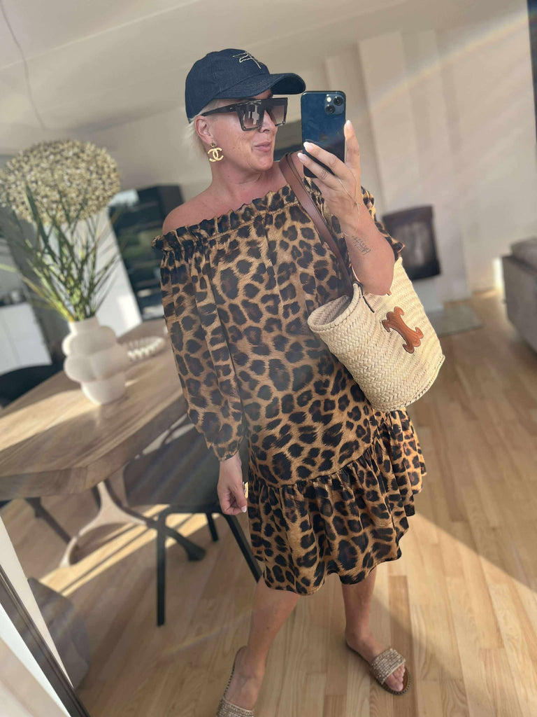 BESKRIVELSE: Lækker kort kjole med off shoulder og 7/8 lange ærmer. Så flot til festlige lejligheder og til en lun sommerdag.