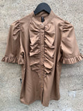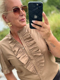 BESKRIVELSE: Utrolig flot skjorte i bomuldskvalitet. Skjorten har gennemgående stolpeluk og korte ærmer med manchet og flæse. Den har smuk krøs / flæse foran på brystet. Lækker blød og behagelig at have på.