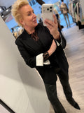 BESKRIVELSE: Flot blazer med lommer foran. Der er revir og 2 knapluk foran på blazeren. Der er skulderpuder i blazeren. Blazeren har smalle lyse striber. Den har hvide opsmøg på ærmerne, der giver en flot effekt. Kan ikke ses når ærmerne ikke er smøget op.