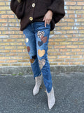 BESKRIVELSE: Smart denim jeans med slidtage og hjerte-lapper. De har opsmøg, så man kan bruge dem stumpet.