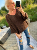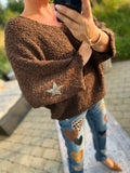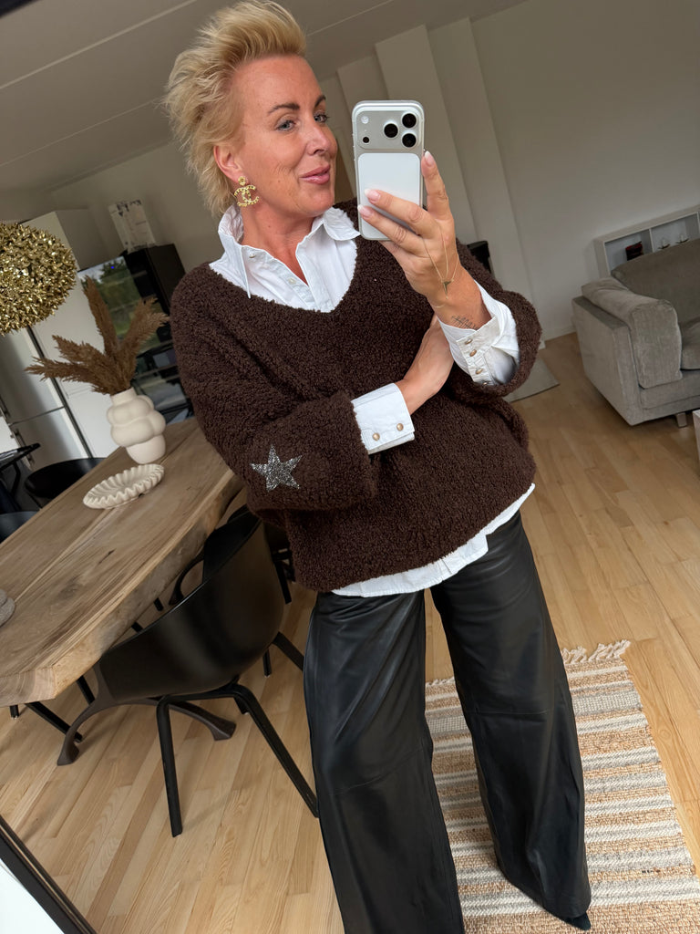 BESKRIVELSE: Lækker strik med V-udskæring og lange ærmer. Den blødeste kvalitet. Der er en glitter-stjerne på hver albue.