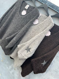 BESKRIVELSE: Lækker strik med V-udskæring og lange ærmer. Den blødeste kvalitet. Der er en glitter-stjerne på hver albue.