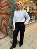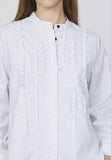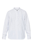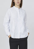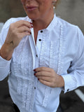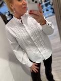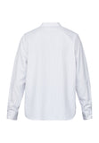 BESKRIVELSE: love1268 er en cool stribet skjorte med lange ærmer. Skjorten har rund hals og er detaljeret med små striber med flæser. Modellen har en str. S på.