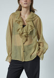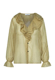 BESKRIVELSE: love1431 er en stilfuld prikket top i et gennemsigtigt stof med flæsedetaljer. Klassiske manchetter og flæser ved halsen giver et sofistikeret udtryk. Modellen har størrelse Modellerne har en str. S på.