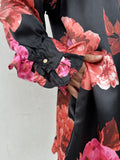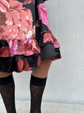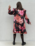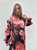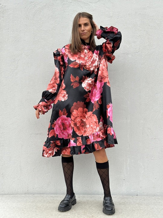 BESKRIVELSE: Festlig blomstret kjole i oversize model, med flæsdetaljer i bunden, samt ved ærmer, skuldre og krave.