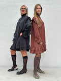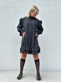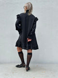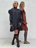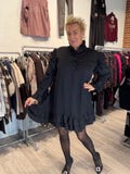 BESKRIVELSE: Festlig satinkjole i oversize model, med flæsdetaljer i bunden, samt ved ærmer, skuldre og krave.