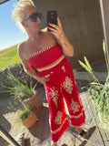BESKRIVELSE: Flot jumpsuit / buksedragt med smock-elastik foroven og ben med vidde nederst. Der er lommer i begge sider. Mønsteret kan falde lift forskelligt ud, end på billedet.