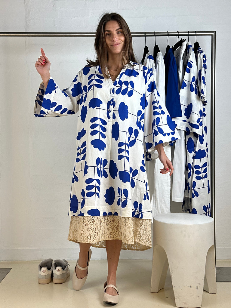 Den V-formede halsudskæring er kombineret med en smal stolpelukning med dekorative knapper, som fungerer som et diskret blikfang og understreger det gennemarbejdede udtryk. Kjolen har brede ærmer i en albuelang længde, der giver volumen og bidrager til den afslappede silhuet. På ryggen er Mumbai Lace Dress udsmykket med et fint logobroderi, som tilfører et eksklusivt og håndværksmæssigt præg. En kjole, der balancerer det enkle og det detaljerige og fungerer smukt både alene og som en del af et lag-på-lag look.