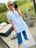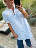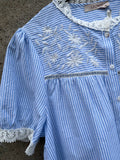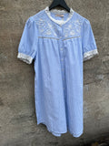 BESKRIVELSE: Smart smalstribet kjole med korte ærmer og fine blondedetaljer. Den kan knappes op foran. Den har broderet blomster på fronten.