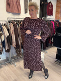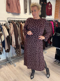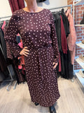 BESKRIVELSE: En elegant lang kjole i mørkebordeaux med lyse prikker, rund halsudskæring, lange ærmer og sideslidser for et flydende fald.