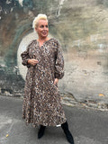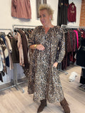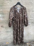 BESKRIVELSE: Lækker kjole med lækre detaljer. Den har 7/8 lange ærmer og er længere bag til.