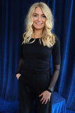 BESKRIVELSE: Smuk bluse med mesh fra over albuen på de lange ærmer. Blusen har rund hals.