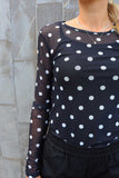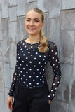 BESKRIVELSE: Smuk og let mesh bluse med lange ærmer og rund hals. Perfekt til under fx T-shirt og strik med korte ærmer. Den er med store hvide prikker.