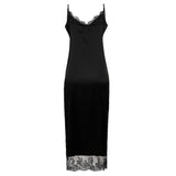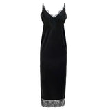 BESKRIVELSE: Smuk stropkjole med justerbare stropper. Den er satin og har blonde på brystet. Kjolen har slidser i begge sider.