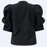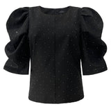 BESKRIVELSE: Utrolig flot bluse i en lækker kvalitet med flotte sten på der glimter. Den har puf-ærmer og er figursyet. Den lukkes med lyn i nakken.