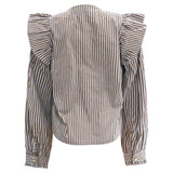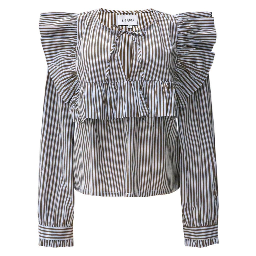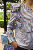 BESKRIVELSE: Utrolig flot bluse / skjorte i en lækker stribet kvalitet. Den har lange ærmer og rund hals, der går ned i V og med bindebånd.