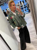 BESKRIVELSE: Smart jakke i blødt kanvasstof - den har krave og lange ærme, der er smarte at smøge op. Den lukkes foran med knapper. Rundt om på jakken er der patches (mærker) med forskellige udsagn og farver og former.