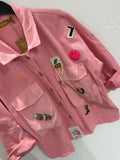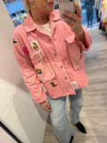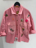 BESKRIVELSE: Smart jakke i blødt kanvasstof - den har krave og lange ærme, der er smarte at smøge op. Den lukkes foran med knapper. Rundt om på jakken er der patches (mærker) med forskellige udsagn og farver og former.