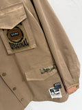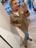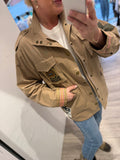 BESKRIVELSE: Smart jakke i blødt kanvasstof - den har krave og lange ærme, hvor der er farverige bånd ved lukningen. Den lukkes foran med knapper. Rundt om på jakken er der patches (mærker) med forskellige udsagn og farver og former. Der er for i jakken.