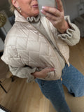 BESKRIVELSE: Smart vest i quilted materiale. Den har høj krave og lynes med lynlås foran. Vesten har skrå-lommer i bege sider. Guldfarvet hardware.