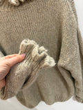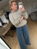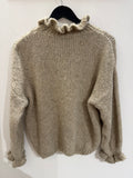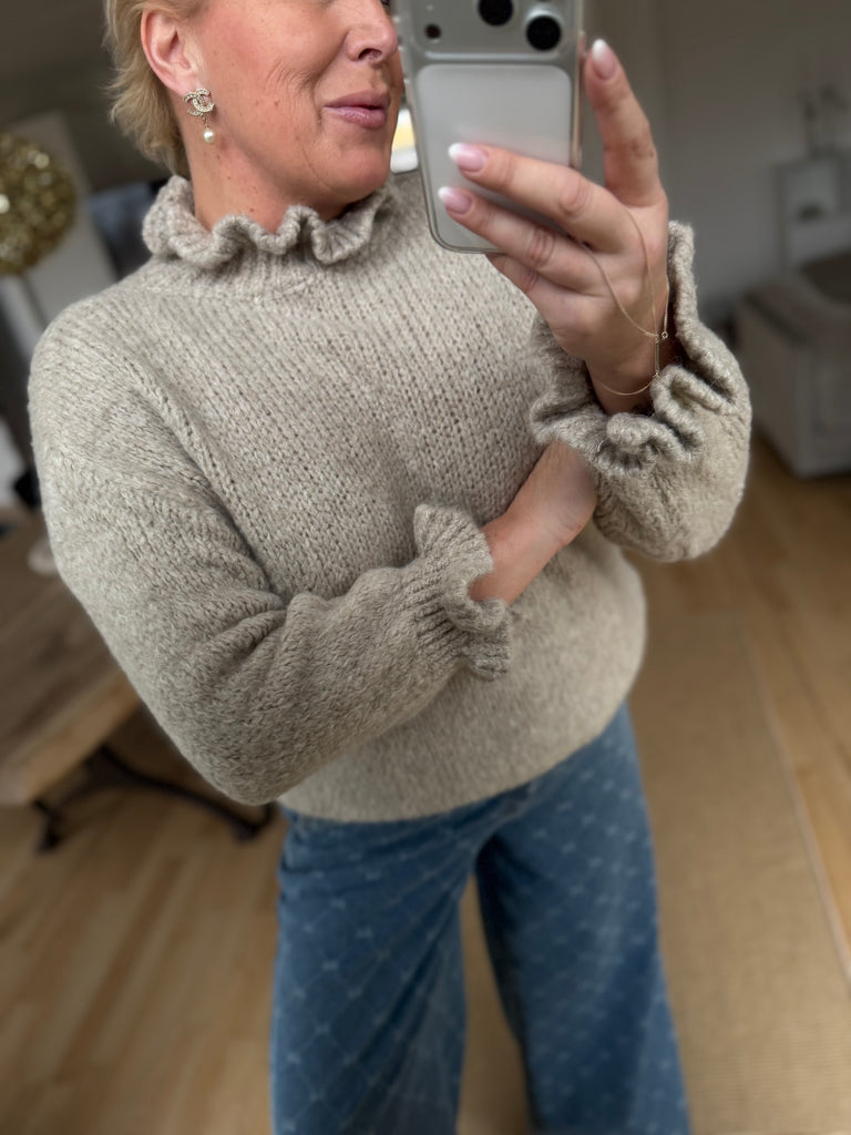 BESKRIVELSE: Smuk strik med høj flæsekrave og lange ærmer med flæse for enden.
