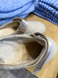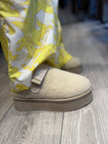 BESKRIVELSE: Lækre sko / futter til både inde og ude. De har tyk plateau sål og teddy på stoffet over vristen. Der er en rem, der kan justeres enten over vristen eller sættes bag hælen. De er lidt store i størrelsen, så svinger du mellem 2 størrelser, skal du vælge den mindste.
