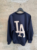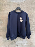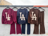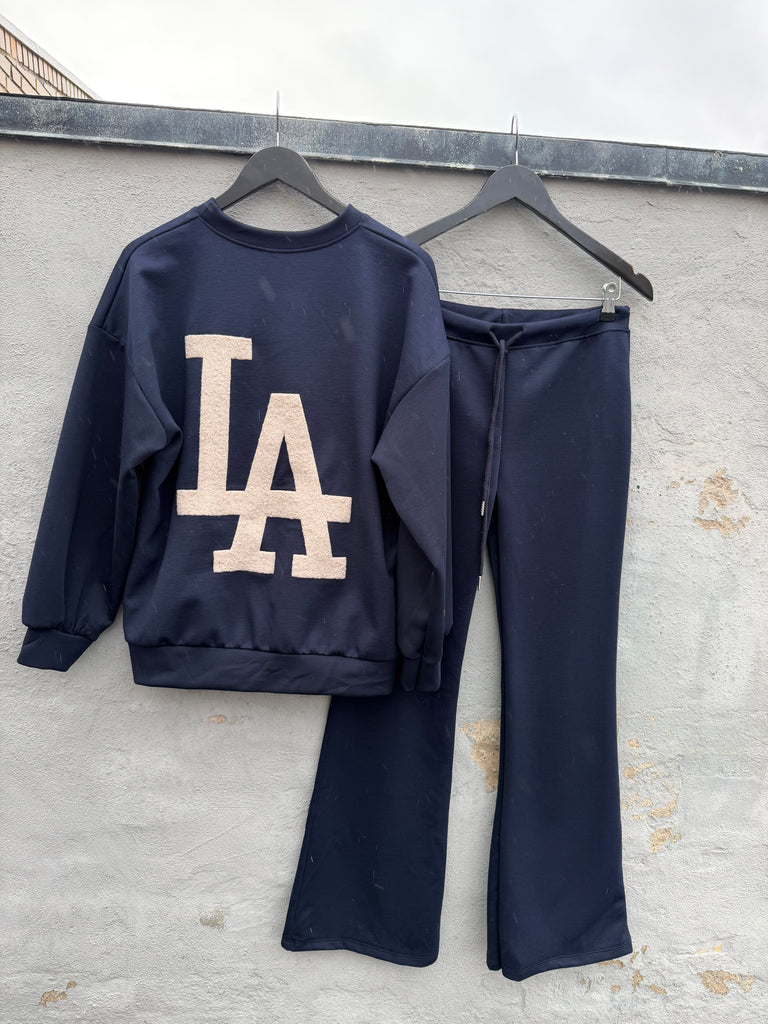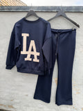 BESKRIVELSE: Lækker blødt sweatshirt / bluse + tilhørende buks. Blusen har rund hals og lange ærmer. Der er tekst (trykt) LA på fronten. Buksen har elastik i taljen og flare i benene nederst.