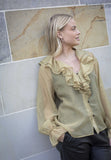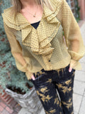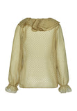 BESKRIVELSE: love1431 er en stilfuld prikket top i et gennemsigtigt stof med flæsedetaljer. Klassiske manchetter og flæser ved halsen giver et sofistikeret udtryk. Modellen har størrelse Modellerne har en str. S på.